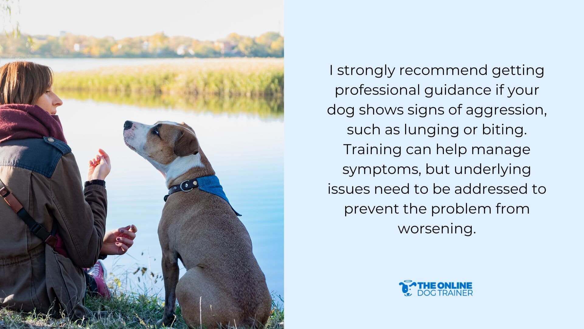 I strongly recommend getting professional guidance if your dog shows signs of aggression, such as lunging or biting. Training can help manage symptoms, but underlying issues need to be addressed to prevent the problem from worsening.