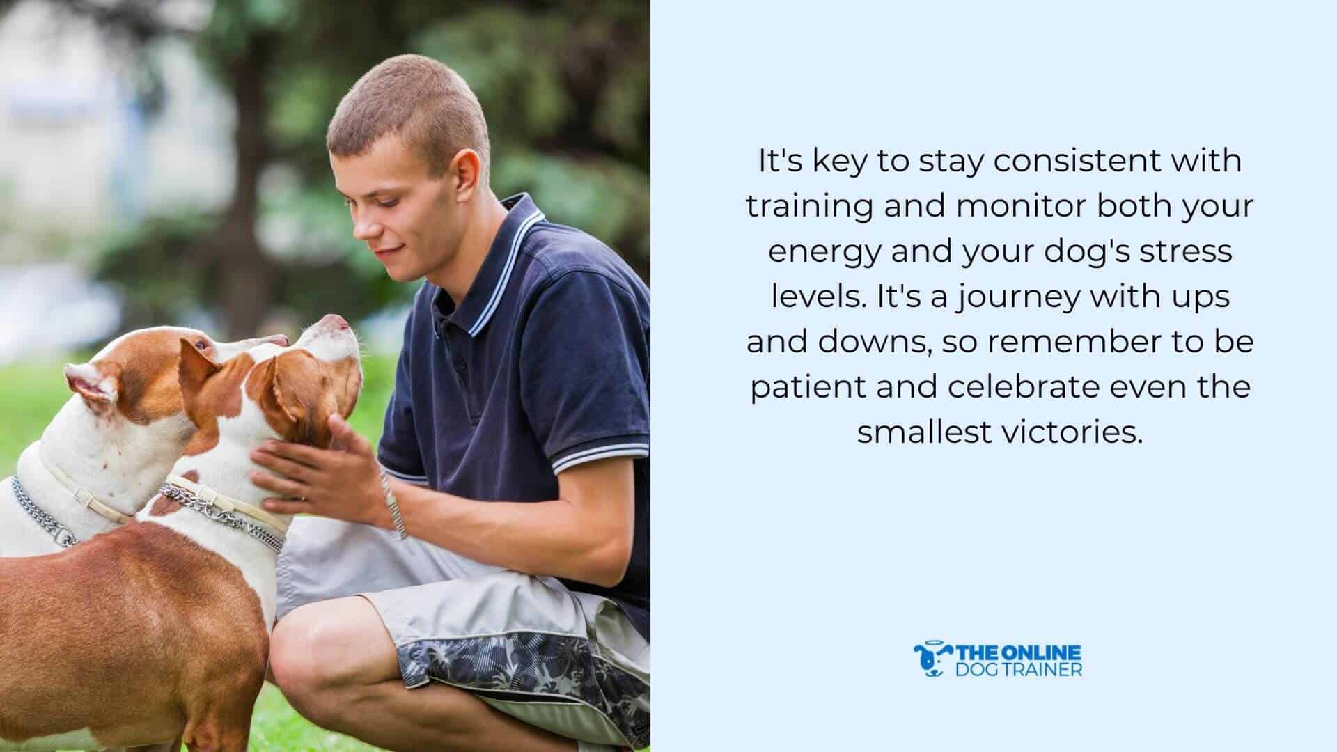It's key to stay consistent with training and monitor both your energy and your dog's stress levels. It's a journey with ups and downs, so remember to be patient and celebrate even the smallest victories.