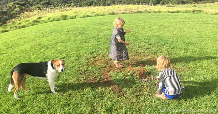 Moses and my children, Sage & Stan, sprinkling flowers on the spot in the garden where we buried Tamar.