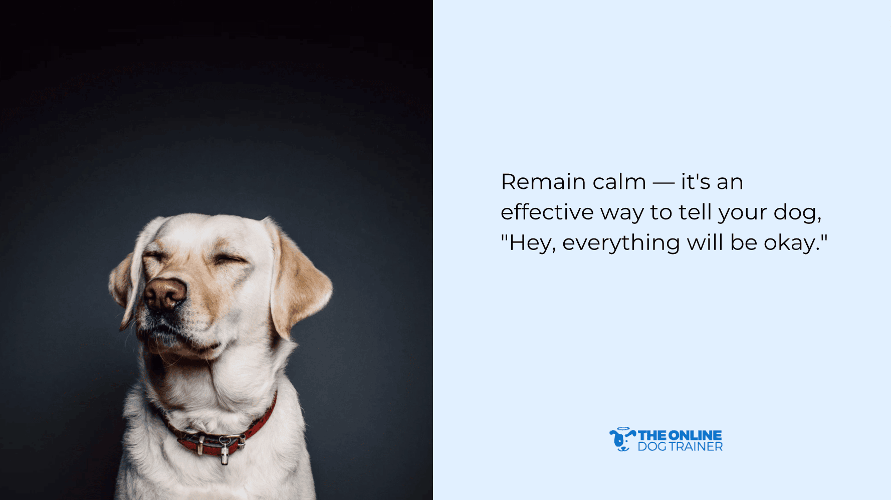 Dogs are pack animals, and they look to their leader for guidance. If you stay calm, your dog is more likely to follow your lead.