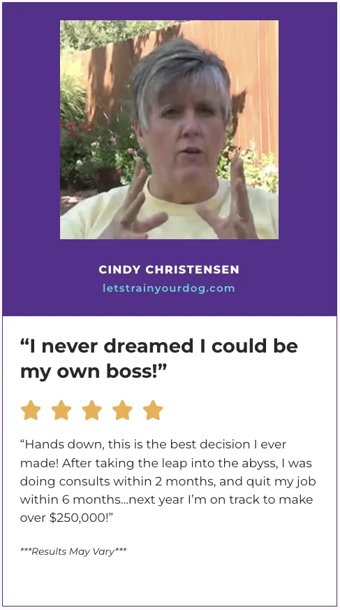 Many of our students start working with paying clients in just a few months. You'll start with the Dog Calming Code™, which gets fast behavioral results. Then we walk you step-by-step through how to turn those skills into a real business.