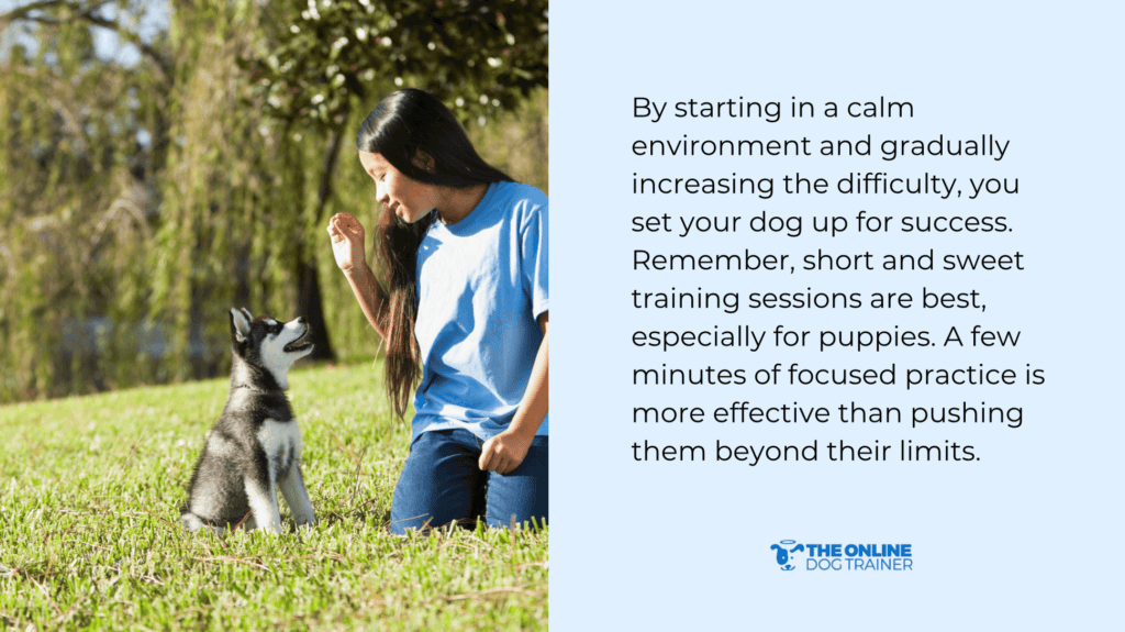 Set your puppy up for success by starting with simple tasks in a quiet environment. Gradually increase the difficulty as they progress.