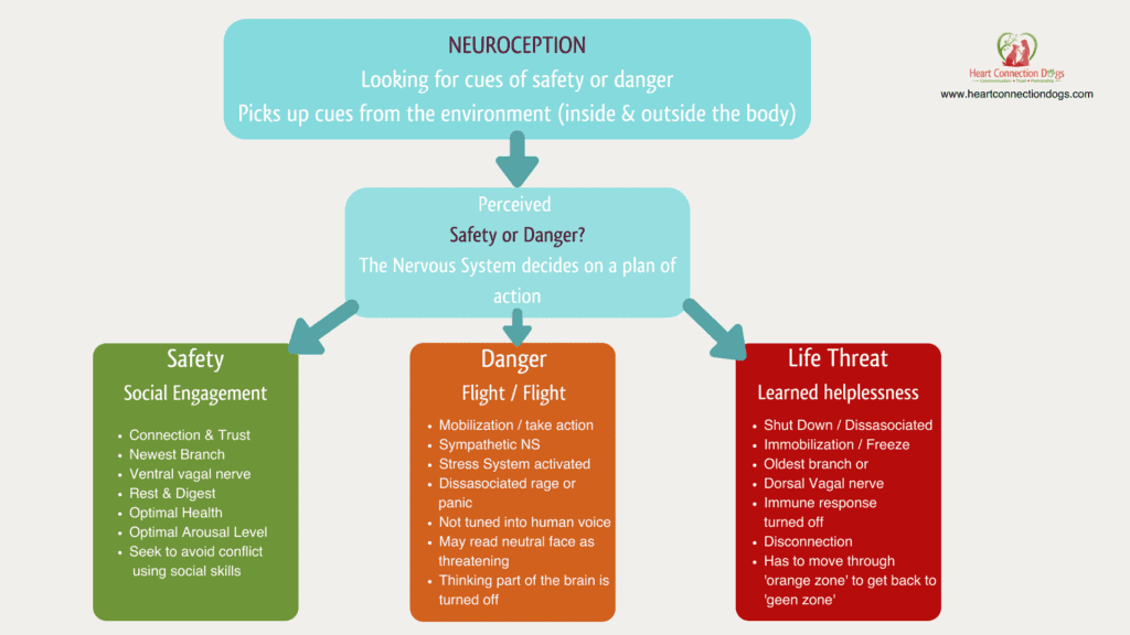 Yeah, yeah. So, the Polyvagal Theory was developed by Stephen Porges. Basically, he looked at our nervous system, at the Autonomic Nervous System, which is common to all vertebrates and mammals. There's three kinds of planes to it, which is the shutdown, the life threat, the helplessness which we call the red zone, and then there is the middle zone which is the fight or flight, which is the danger zone. That happens when we are motivated to take action in order to get rid of that danger. So, our nervous system picks up that we're in danger. There's something called Neuroception. We discussed this in our last chat, and this is happening all the time in our subconscious. We're not conscious of it. Our nervous system is looking for cues in the environment, whether it be inside our body or outside our body, and it's looking for these cues in the environment: Is this safe or is this something dangerous? If it picks up something dangerous they're going to go automatically into the fight or flight mode.