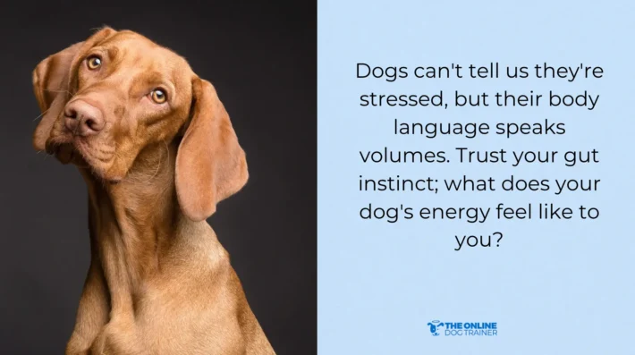 Dogs can't tell us they're stressed, but their body language speaks volumes. Trust your gut instinct; what does your dog's energy feel like to you? Are they happy, tired, or relaxed? Often, your intuition will accurately tell you if something is off.